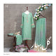 With its spellbinding silhouette and off-white tone, Chambeli is a pure cotton net draped dress artistically crafted with hand embellishments and crystals. The gleaming embellishments and laces are forming beautiful floral stencils uplifting the look with a glamorous charm. The look is completed with plain pants, concluding this look ethereally with an embroidered chiffon dupatta impressively edged with lace.