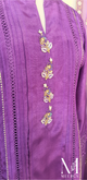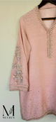 A soft expression of elegance, this Pink Cotton Net shirt features delicate pintucks and lace detailing, beautifully complemented by a hand-embroidered motif on the neckline. Paired with a plain trouser and an intricately Aari-embroidered cotton net dupatta, this ensemble embodies timeless charm.